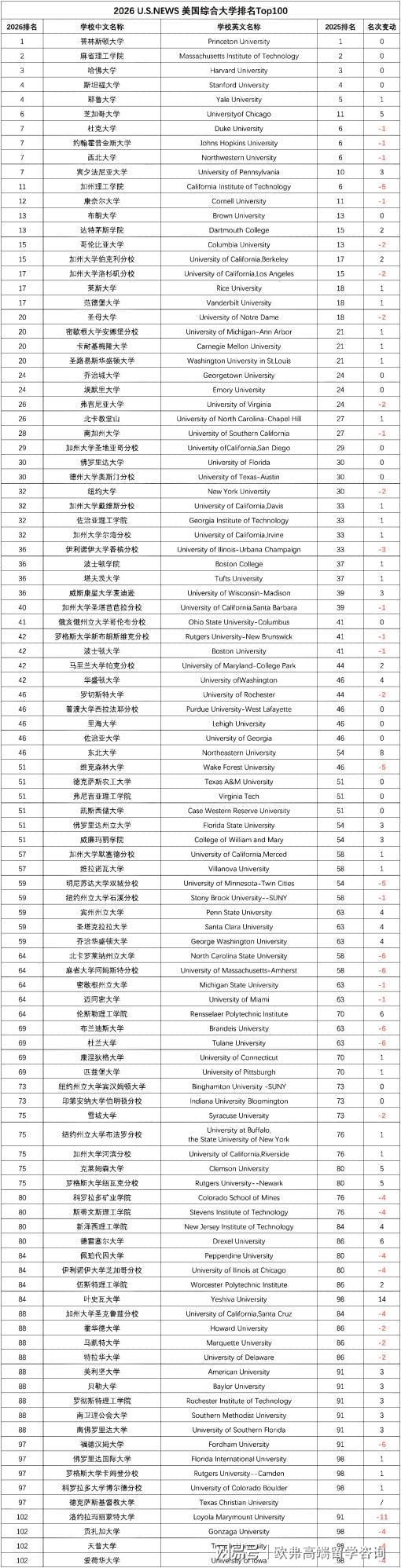 2026USNews全美最佳大学排名发布!普林斯顿稳居第一