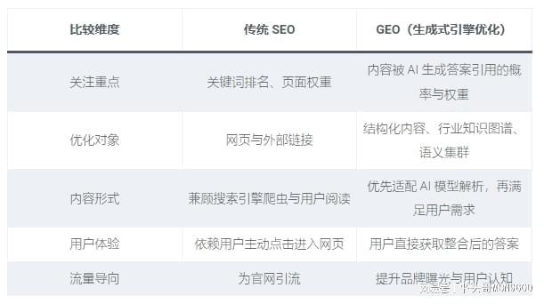 很多 B2B 企业误以为 GEO 是 SEO 的 “进阶版”,实则二者在核心目标与运作逻辑上存在本质差异。传统 SEO 的核心是 “争夺排名”,通过优化关键词密度、外链数量等,让官网在搜索引擎结果页(SERP)中靠前,最终引导用户点击链接;而 GEO 的核心是 “成为答案”,针对 AI 生成式模型的筛选机制,优化内容的 “可理解性、权威性、相关性”,让品牌信息直接嵌入 AI 给出的 “答案卡片” 或摘要中 —— 用户无需跳转网页,就能看到企业的技术解读、产品方案,决策路径被大幅缩短。